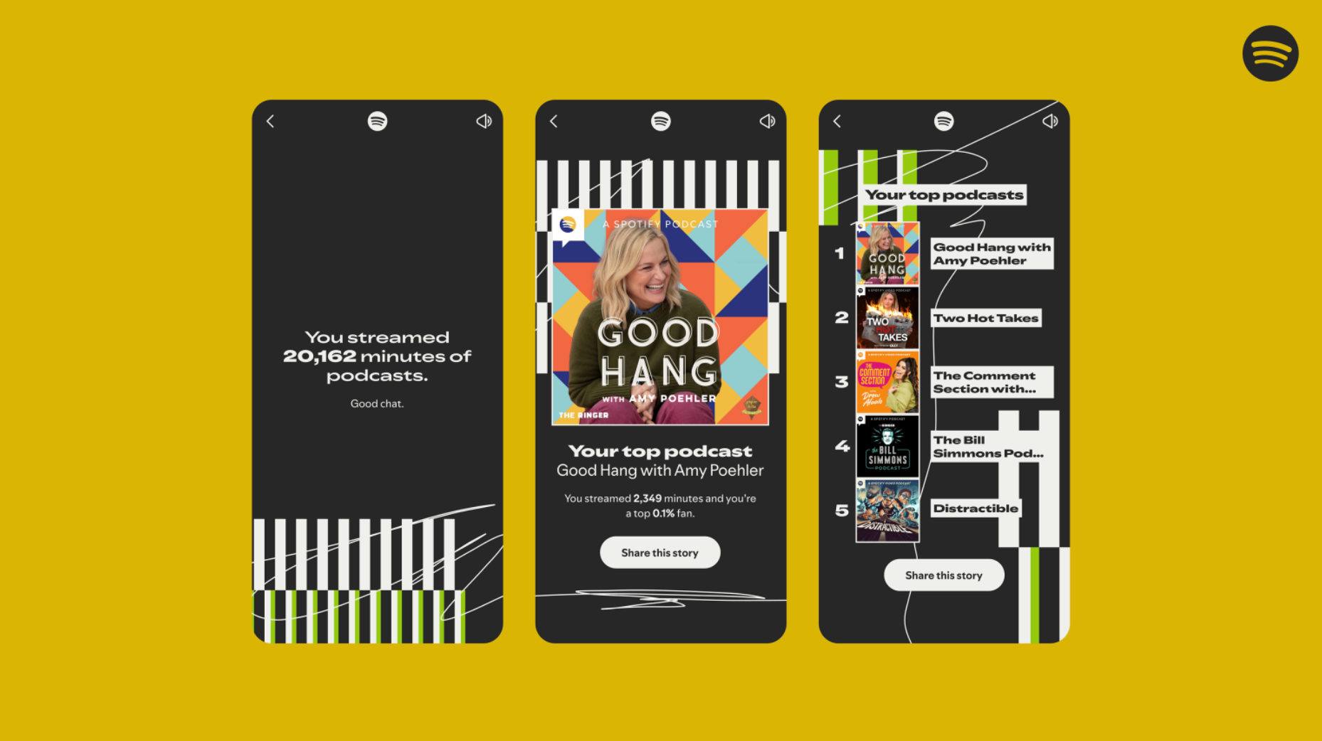 Spotify Wrapped takes your listening data and turns it into bite-sized, visually compelling stories. These include: