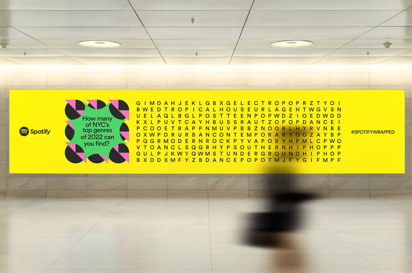 2022’s themes are self-expression and play. These come to life in the visual identity, messaging and creative execution. Spotify has dialled up the playfulness with a subway poster to offer New York commuters a word-search game around guessing popular genres.